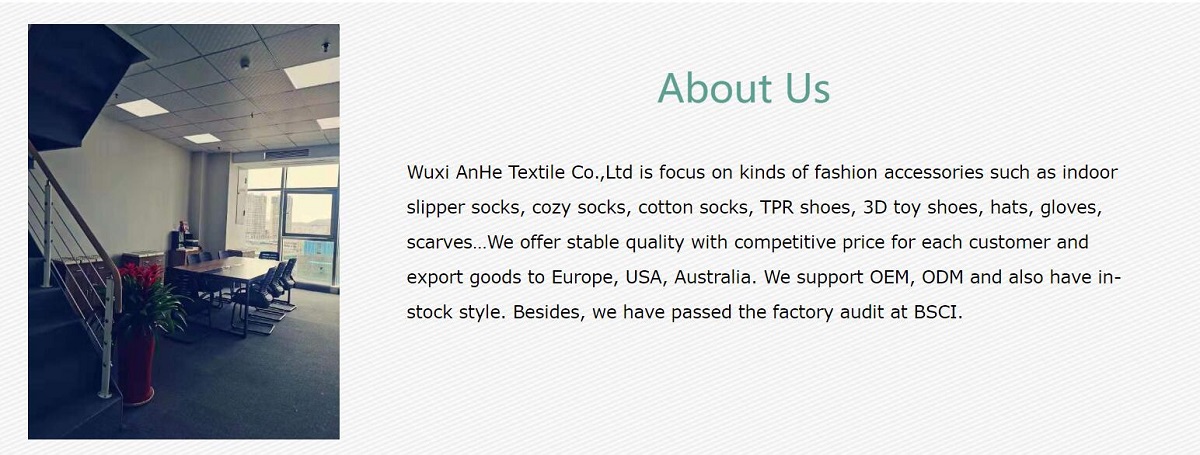 Wuxi AnHe Textile Co.,Ltd is focus on kinds of fashion accessories such as indoor slipper socks, cozy socks, cotton socks, TPR shoes, 3D toy shoes, hats, gloves, scarves…We offer stable quality with competitive price for each