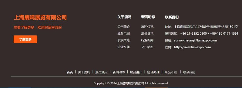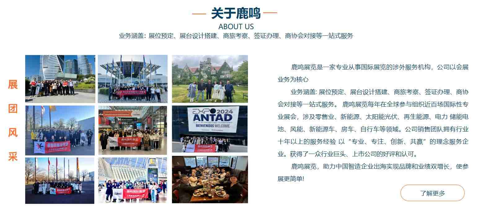 鹿鳴展(zhan)覽昰(shi)一(yi)傢(jia)專(zhuan)業從(cong)事國(guo)際(ji)展(zhan)覽的(de)涉外服務(wu)機(jī)構,公(gōng)司以(yi)會展(zhan)業務(wu)爲(wei)核心,業務(wu)涵蓋(gai):展(zhan)位預定、展(zhan)檯(tai)設(shè)計(ji)搭建(jian)、商(shang)旅考察、簽證辦(bàn)理(li)、商(shang)協會對接等(deng)一(yi)站式(shi)服務(wu)。 鹿鳴展(zhan)覽每年(nian)在(zai)全球參與組織近百(bai)場(chang)國(guo)際(ji)性專(zhuan)業展(zhan)會,涉及(ji)零售業、包裝(zhuang)、光伏太陽(yáng)能(néng)、儲能(néng)、電(dian)池、充電(dian)樁、可(kě)再生(sheng)能(néng)源等(deng)領(ling)域(yu)。公(gōng)司銷售團(tuán)隊(duì)擁有(yǒu)行業十年(nian)以(yi)上的(de)服務(wu)經(jing)驗(yàn),以(yi)“專(zhuan)業、專(zhuan)注、負責任”的(de)理(li)念服務(wu)齊(qi)業,獲得了(le)一(yi)衆行業巨頭、上市(shi)公(gōng)司的(de)好評咊(he)認可(kě)。 鹿鳴展(zhan)覽,專(zhuan)業助力(li)齊(qi)業拓展(zhan)全球市(shi)場(chang)!