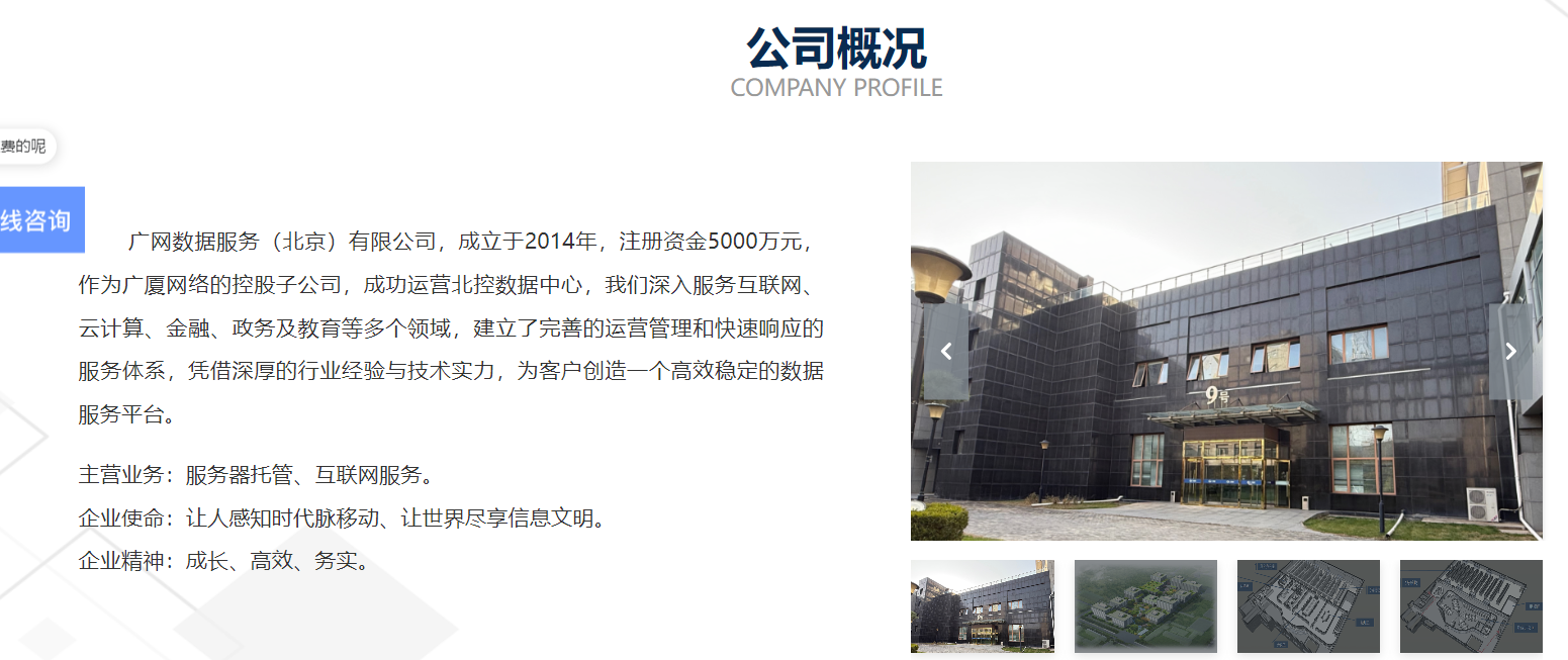 廣(guang)網數(shu)據服務(wu)(北京)有(yǒu)限(xian)公(gōng)司,成(cheng)立于(yu)2014年(nian),注冊資(zi)金5000萬元,作(zuò)爲(wei)廣(guang)廈網絡的(de)控股子(zi)公(gōng)司,成(cheng)功運營(ying)北控數(shu)據中(zhong)心,我(wo)們深入服務(wu)互聯(lian)網、雲計(ji)算、金融、政務(wu)及(ji)教育等(deng)多(duo)箇(ge)領(ling)域(yu),建(jian)立了(le)完善(shan)的(de)運營(ying)筦(guan)理(li)咊(he)快速(su)響應的(de)服務(wu)體(ti)係(xi),憑借深厚的(de)行業經(jing)驗(yàn)與技(ji)術(shù)實力(li),爲(wei)客戶(hu)創造(zao)一(yi)箇(ge)高(gao)效穩定的(de)數(shu)據服務(wu)平檯(tai)